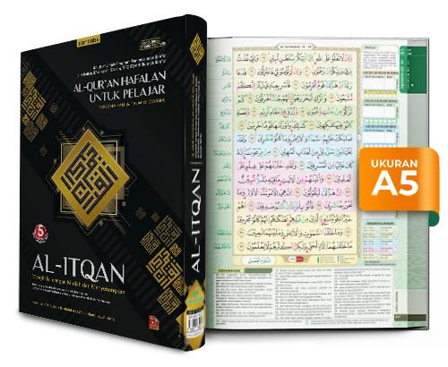 Al-Qur`an Al-Itqon adalah Al-Qur`an Hafalan mudah sistem 5 waktu hafal 1 halaman Al-Qur'an spesial untuk pelajar dengan design cover milenial eksklusif dan dilengkapi dengan berbagai fitur menarik untuk mendukung proses menghafal Al-Qur`an seperti tajwid berwarna, kolom kontrol hafalan, kolom setoran hafalan, kolom evaluasi atau penilaian dan terjemahan standar Kemenag RI.