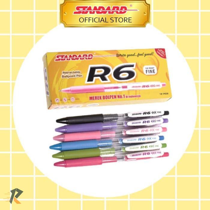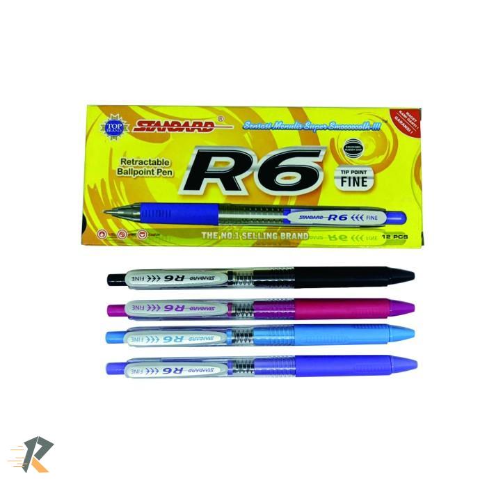 Pulpen Standard R6 yang berbentuk Retractable Ballpoint Pen dengan Fitur Auto Retract membuat konsumen merasa lebih aman tidak perlu khawatir noda tinta akan terkena kantong kemeja dan dengan Rubber grip yang membuat menulis menjadi lebih Nyaman. Hadir dengan berbagai varian warna body : Pink, Light Blue, Light Purple, Black / Mix Color dalam 1 box dengan Tinta Warna Hitam (Oil Gel) dan Tinta Warna Biru, Body-nya juga Biru / Tidak Warna Warni.